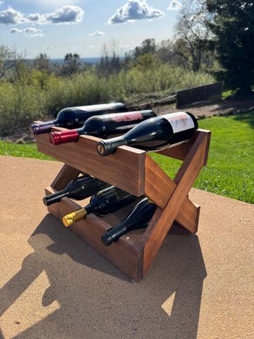 Table top wine rack for your 6 favorite bottles of wine. Adjustable on size and stain. Can add font or graphics.