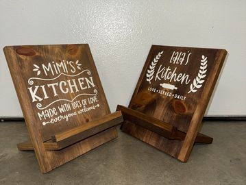 Customizable cookbook stands. Adjustable to fit any cookbook or iPad. Lots of stain and graphic options.