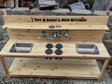 5’ mud kitchen with 2 sinks and 4 burners. Includes bottom shelf and small top shelf with hooks. Sanded and sealed. Available in cedar $320 or redwood $360. Option to add stainless steel pots and pans set for $20.