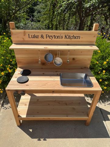 3’ mud kitchen with 1 sink and 2 burners. Includes bottom shelf and small top shelf with hooks. Sanded and sealed. Available in cedar $170 or redwood $200. Option to add stainless steel pots and pans set for $20.